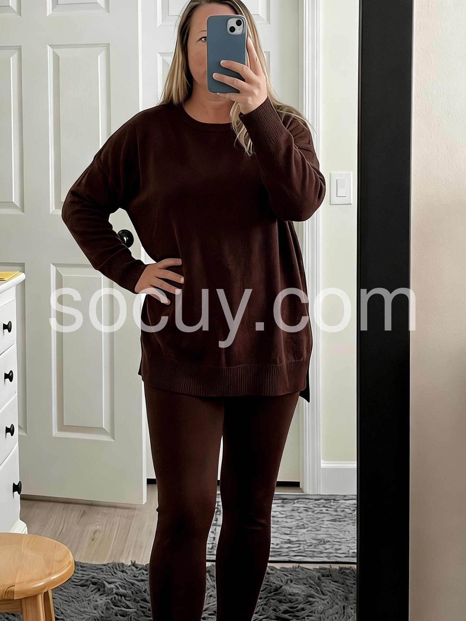 Comfy Round Neck Long Sleeve Side Slit Hem Two Piece Set