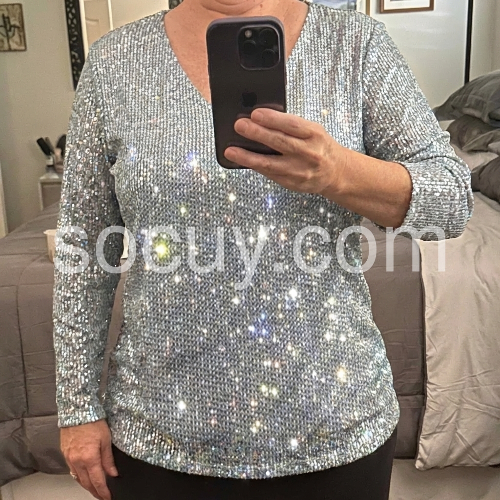 Don't miss out on this beautiful v-neck top! The intricate sequin detailing is sure to make a statement and the v-neck cut gives it a modern feel. This top is perfect for any special occasion or night out.