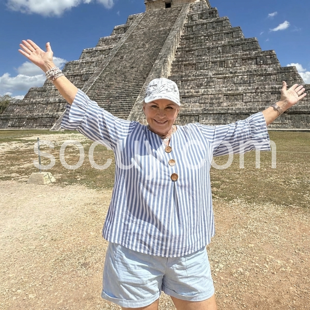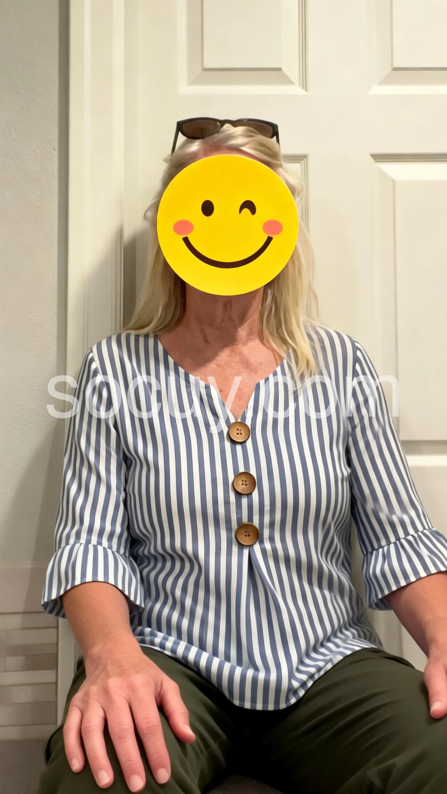 This three-quarter sleeve top features vertical blue and white stripes. V-neckline with front wooden buttons for a relaxed look. Flared ruffle cuffs add delicate detail. Lightweight fabric perfect for casual wear. Ideal for pairing with jeans or skirts.