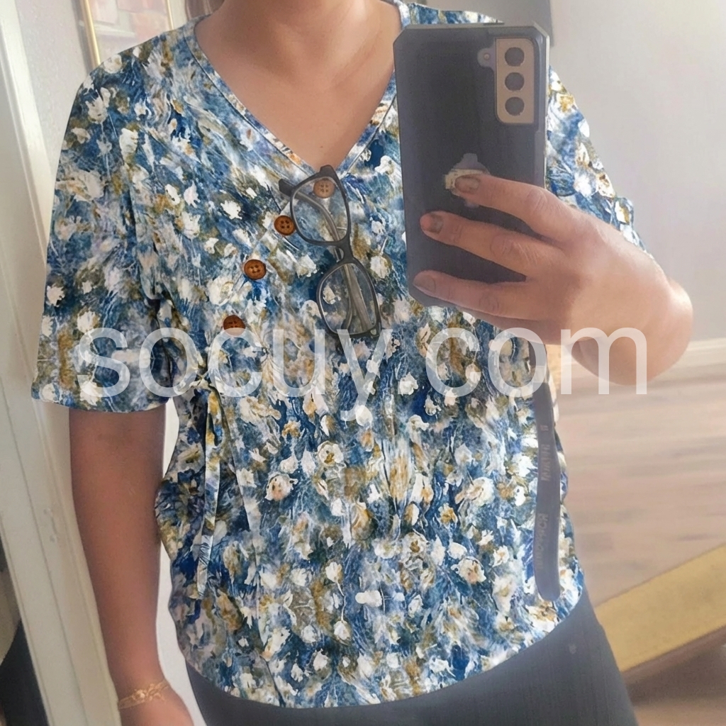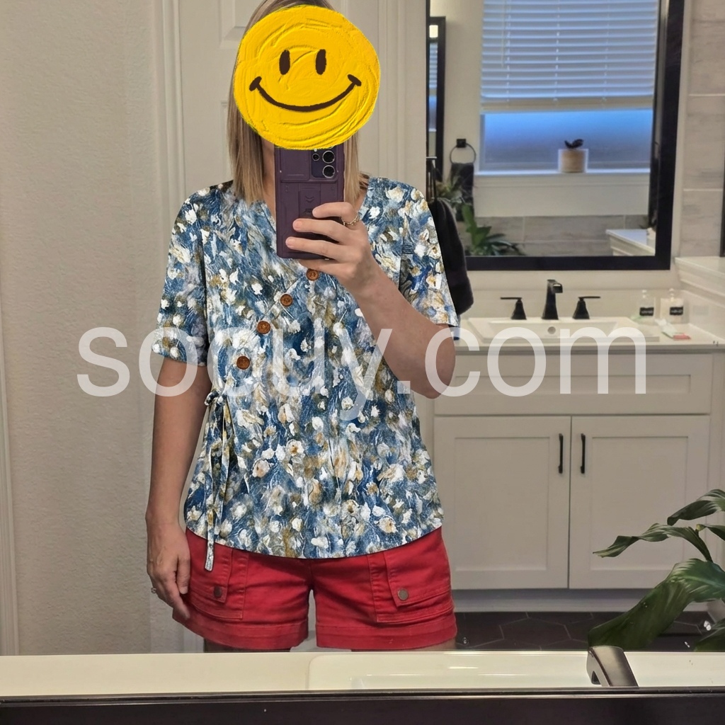 This blouse blends artistic watercolor florals with a flattering wrap silhouette.
