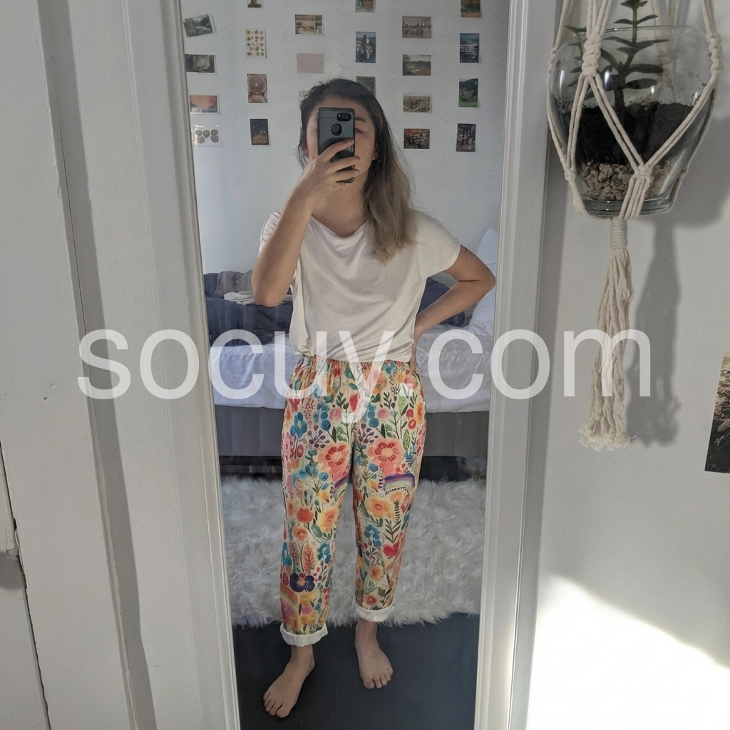 These loose-fit harem pants feature a vibrant floral pattern with rainbow accents. Elastic waistband and cuffed ankles for comfort. Lightweight fabric perfect for warm weather. Ideal for beach days or casual outings. Playful and effortlessly stylish.