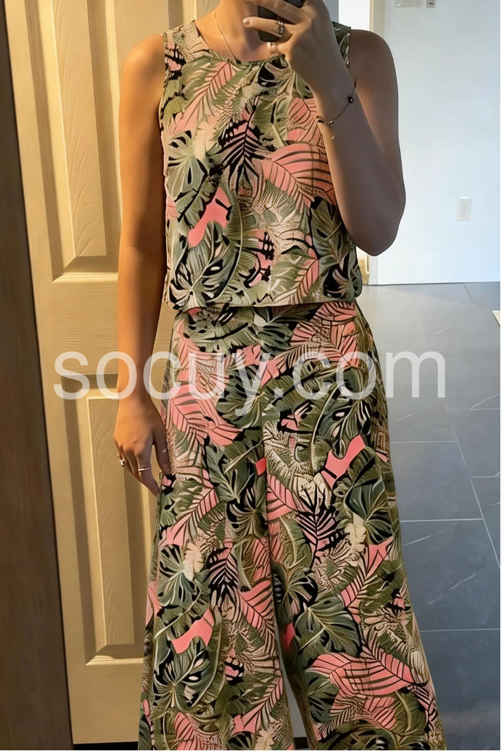 This coordinated set features a sleeveless crop top and wide-leg pants in a bold tropical leaf print. The mix of green, pink, and black creates a lively summer vibe. Lightweight fabric for comfort and ease. Perfect for beach days or casual outings. Effortlessly stylish with a nature-inspired flair.