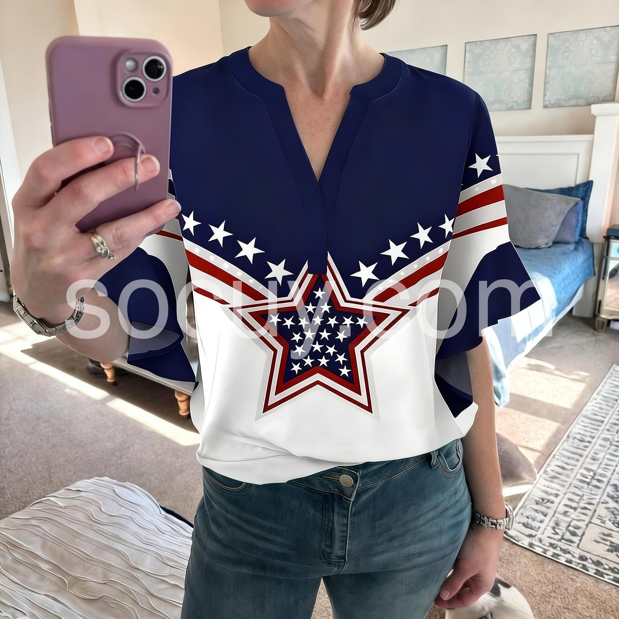This V-neck top features a bold American flag-inspired design with red, white, and blue stars. The ruffled sleeves add a feminine flair. Loose fit for comfort and ease. Perfect for 4th of July or patriotic events. Ideal for casual summer wear.