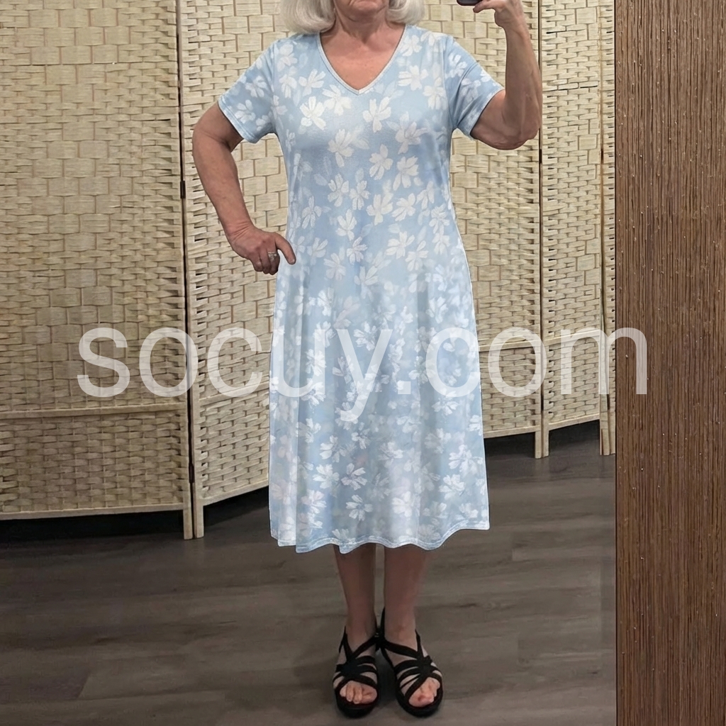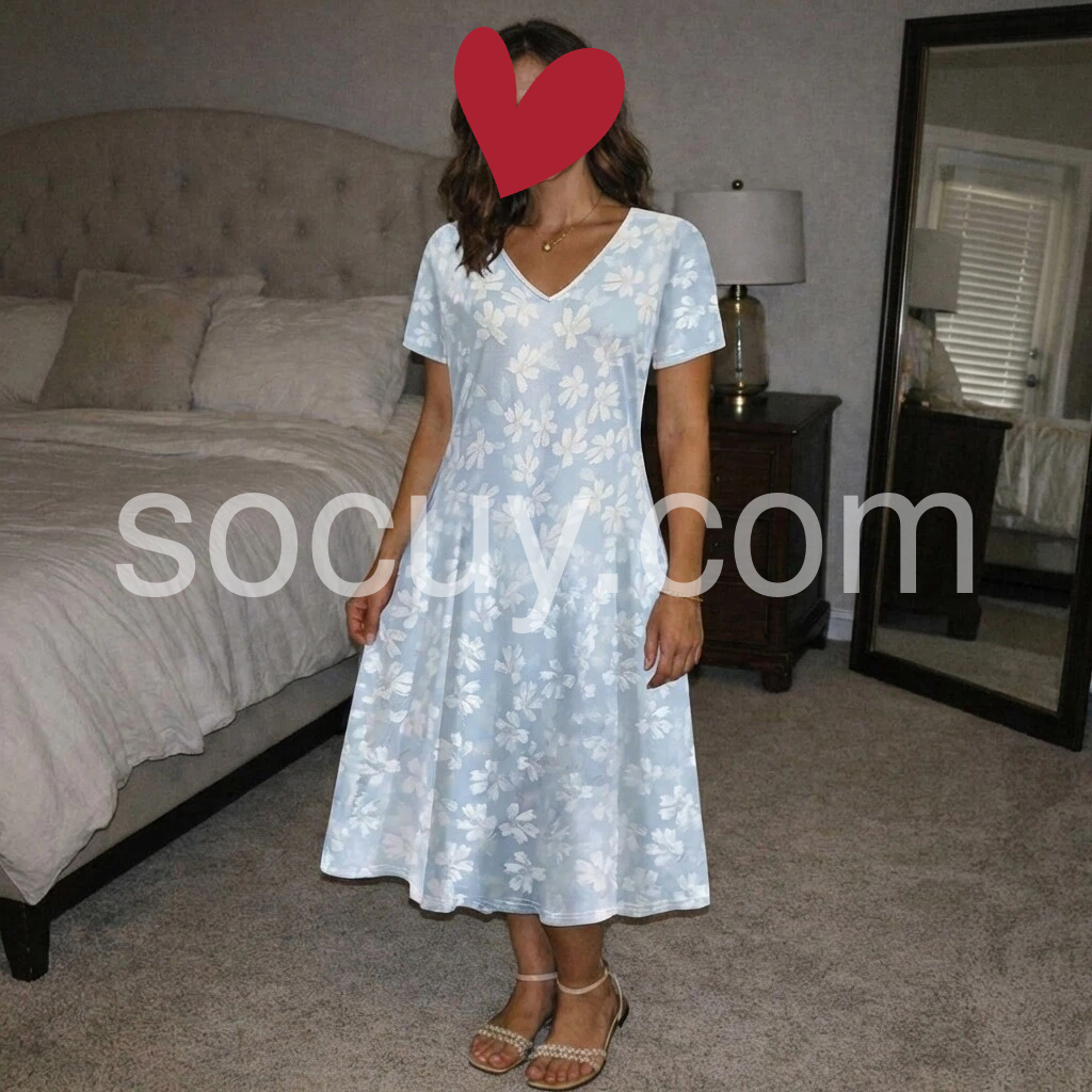 The V-neck, flowy A-line silhouette, and deep pockets create a flattering, comfortable fit for everyday wear.